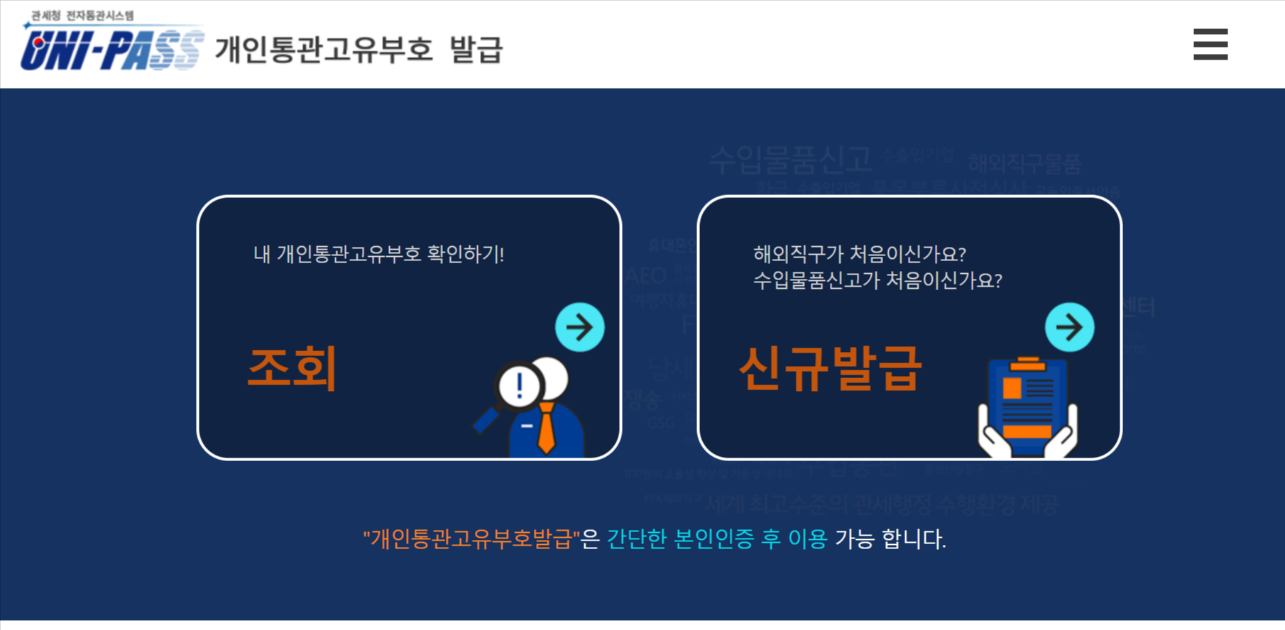 - 인터넷 개인통관고유부호 발급 시스템 앱을 접속합니다.