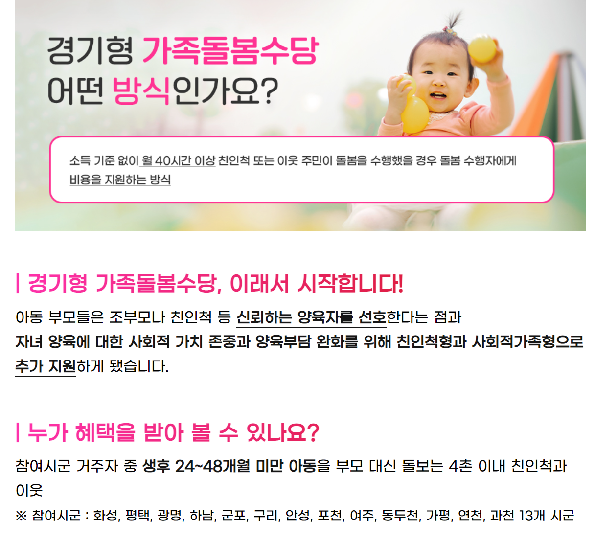경기도 가족돌봄수당은 경기도가 2024년에 도입한 혁신적인 복지 정책입니다. 이 제도는 맞벌이 가정의 양육 부담을 덜어주고, 다양한 형태의 가족 돌봄을 지원하기 위해 마련되었습니다. 특히, 전국 최초로 이웃 주민까지 돌봄 조력자로 인정하여 사회적 가족의 개념을 확대한 점이 주목받고 있습니다.