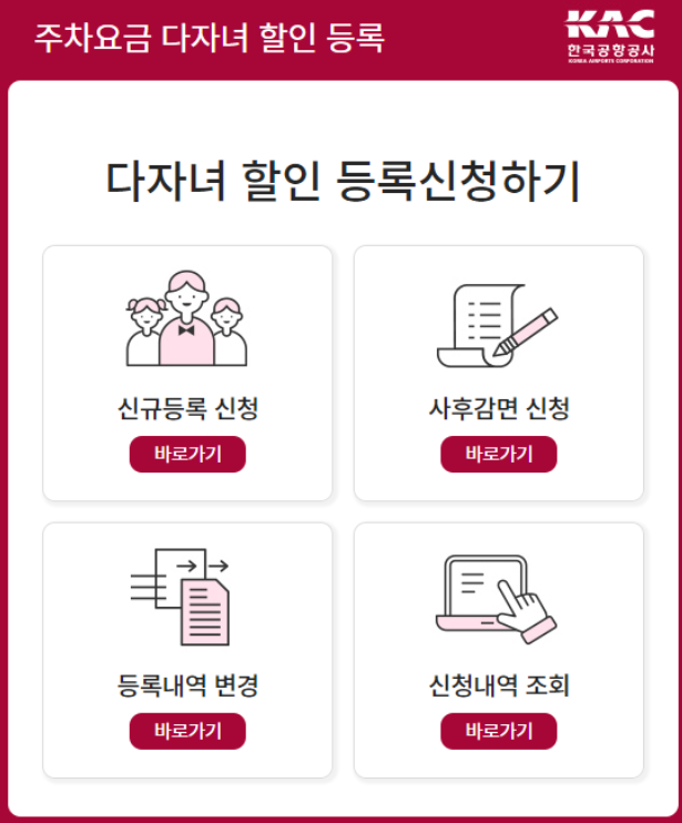 김포공항 주차요금 할인을 받기 위해서는 대부분 별도의 증빙 서류가 필요하지 않습니다. 행정정보 조회를 통해 실시간으로 할인이 적용됩니다. 다만, 다자녀 가정의 경우 사전에 다자녀할인등록 홈페이지에서 관리자 승인을 받아야 합니다. 이러한 간편한 절차 덕분에 김포공항 주차요금 할인을 쉽게 받을 수 있습니다.