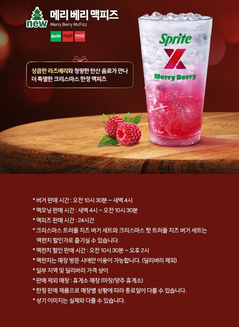 음료로는 이번 시즌에 새롭게 출시된 메리 베리 맥피즈를 선택하는 것도 좋습니다. 라즈베리 시럽과 제로콜라의 조합으로 산뜻하면서도 가볍게 즐길 수 있으며, 붉은 색감이 크리스마스 분위기와 잘 어울립니다. 물론 전통적인 감자튀김이나 치즈스틱도 크리스마스 트러플 치즈버거와 잘 어울리는 선택입니다.