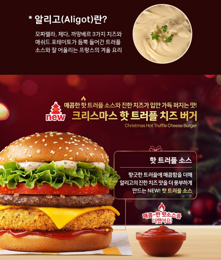 크리스마스 트러플 치즈버거는 맥도날드가 연말 시즌을 맞아 특별히 선보인 한정 메뉴입니다. 이 버거의 가장 큰 특징은 프랑스 남부 지방의 대표적인 겨울 요리인 '알리고'를 크로켓 형태로 재해석해 버거 안에 넣었다는 점입니다. 알리고는 치즈와 감자를 섞어 만든 요리로, 부드럽고 담백한 맛이 특징입니다.
