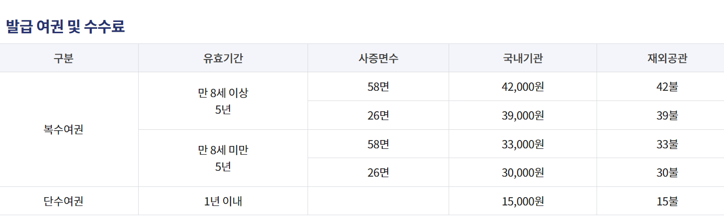 - 수수료: 일반 여권은 30,000원, 대형 여권은 38,000원입니다.