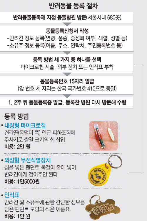 등록 비용은 내장형 무선식별장치의 경우 1만원, 외장형은 3천원입니다. 단, 무선식별장치 구매비용과 내장형 시술 비용은 별도로 발생합니다. 최초 등록 시에는 반드시 반려동물과 함께 방문하여 등록해야 합니다.