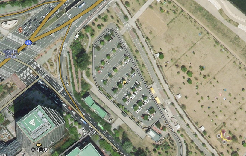 마포대교 남단의 2주차장은 여유로운 주차 공간과 한강 조망이 특징입니다.