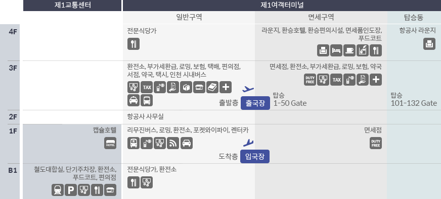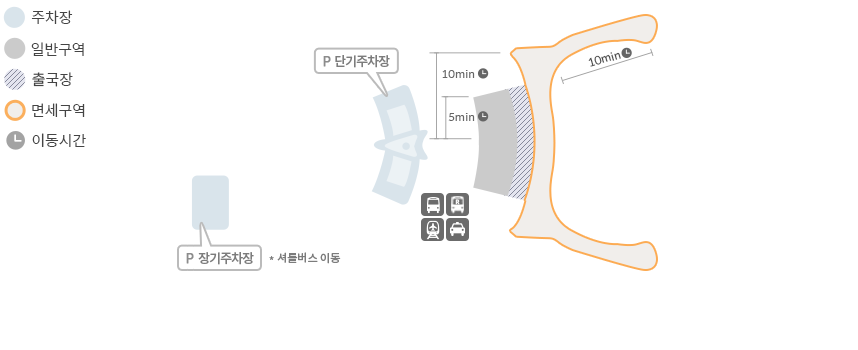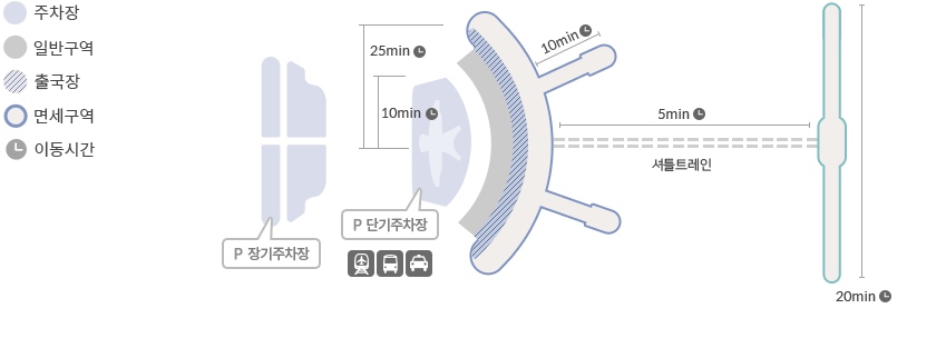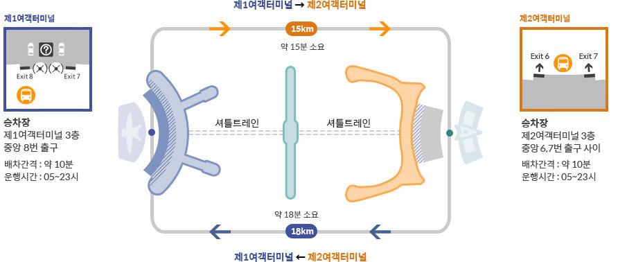 - 출발층(3층)에서는 항공사와 가까운 위치에서 5분 이내로 승하차 가능합니다.