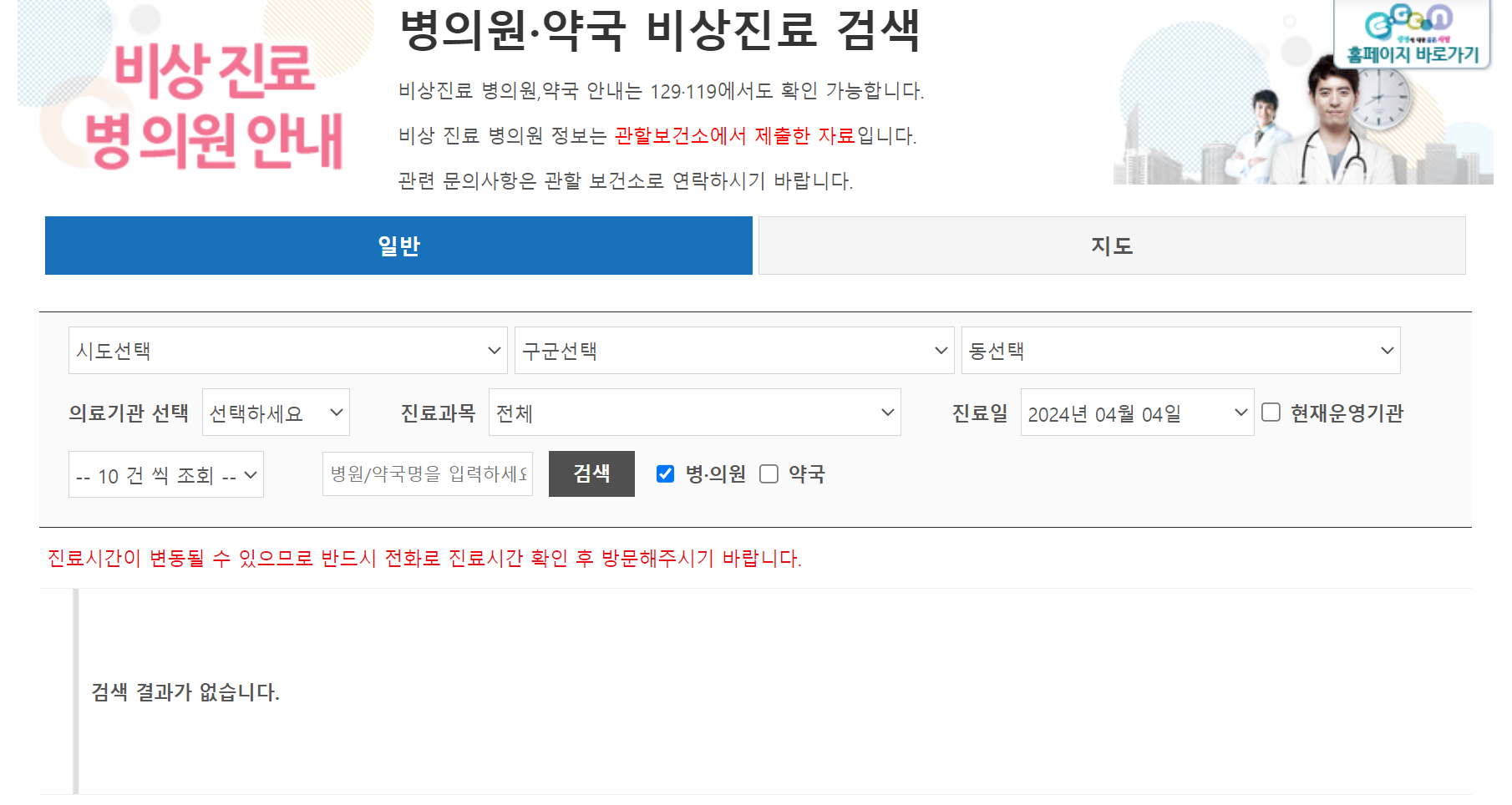 응급의료포털 e-gen으로 일요일 병원 찾기