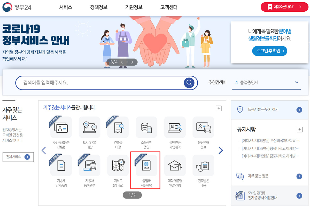 - 출입국사실증명 메뉴 찾기: 홈페이지 메인 화면의 '자주 찾는 서비스' 목록에서 '출입국 사실증명'을 클릭합니다.