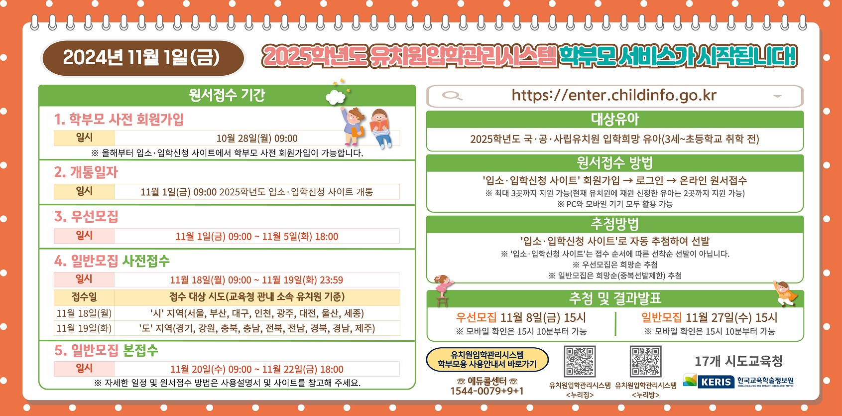 - 일반모집 사전접수(11월 18일, 19일)는 유치원 입학 온라인 서비스만 제공됩니다.